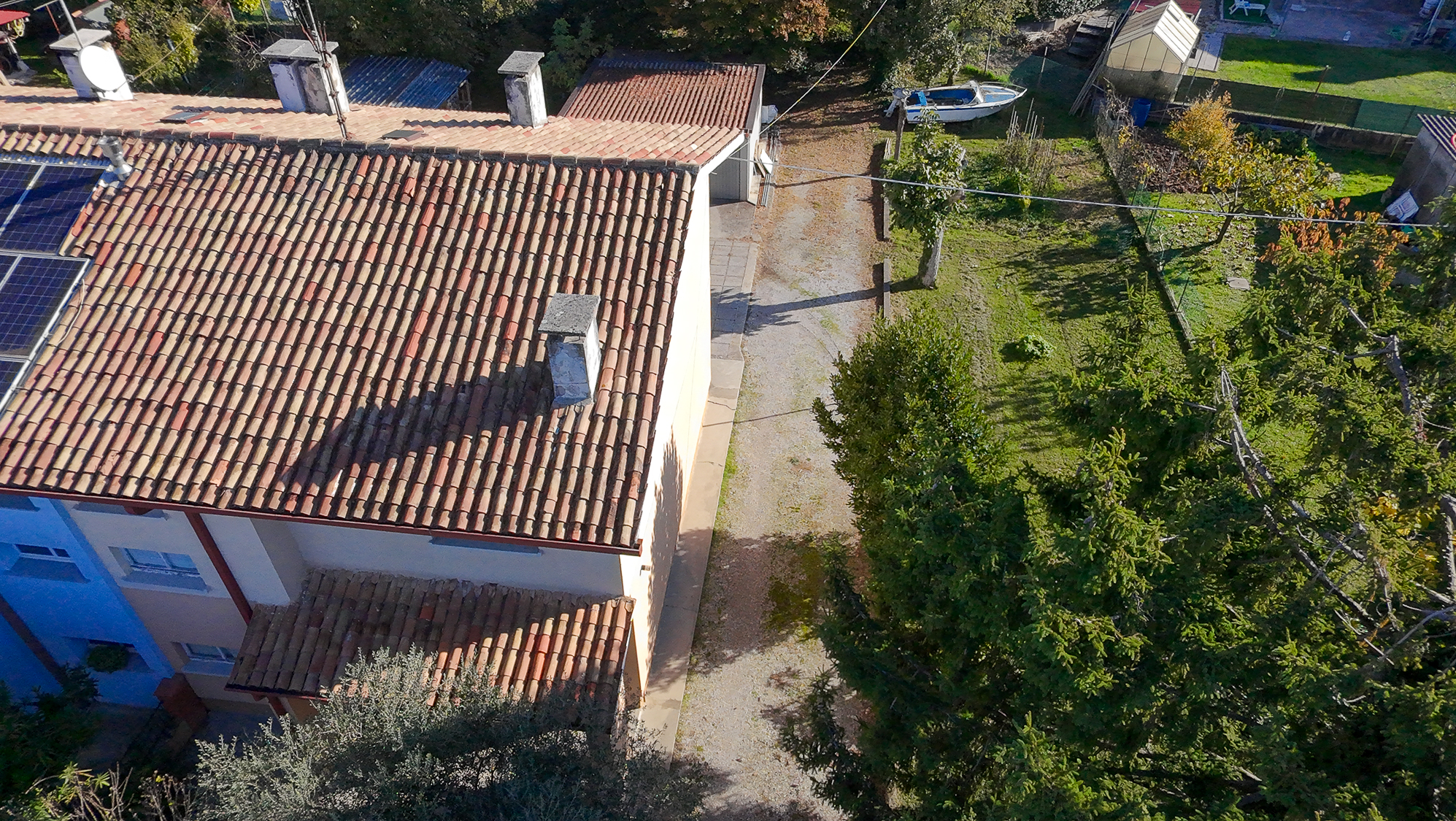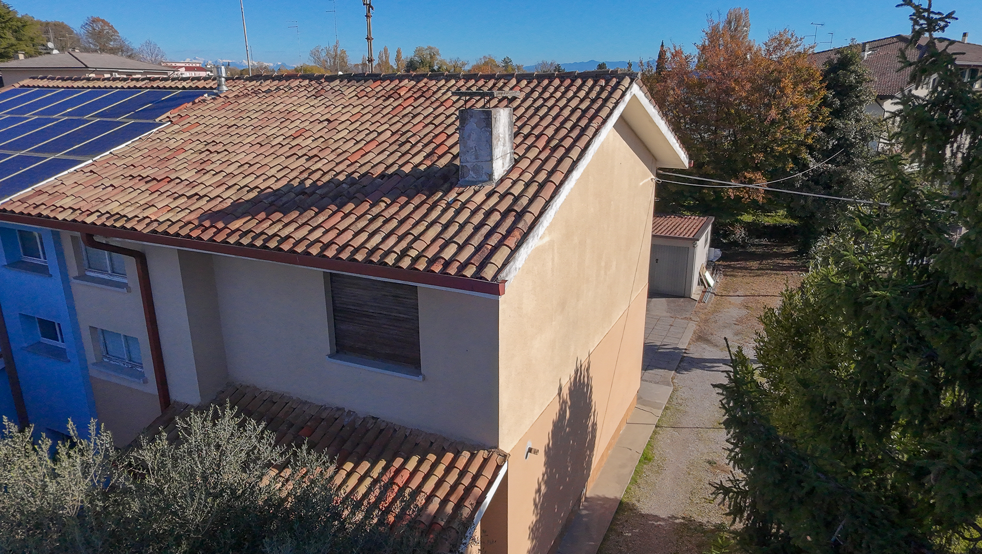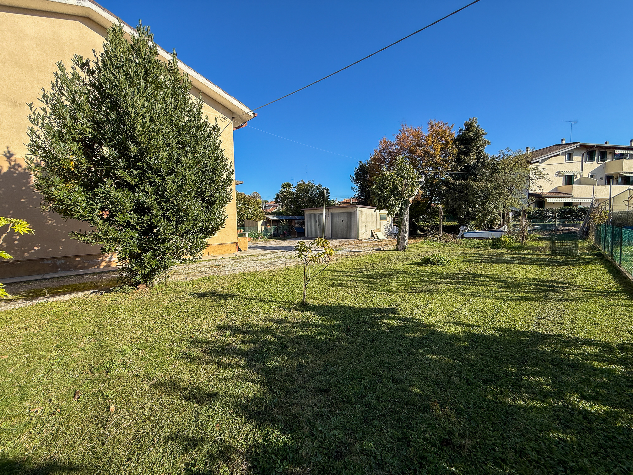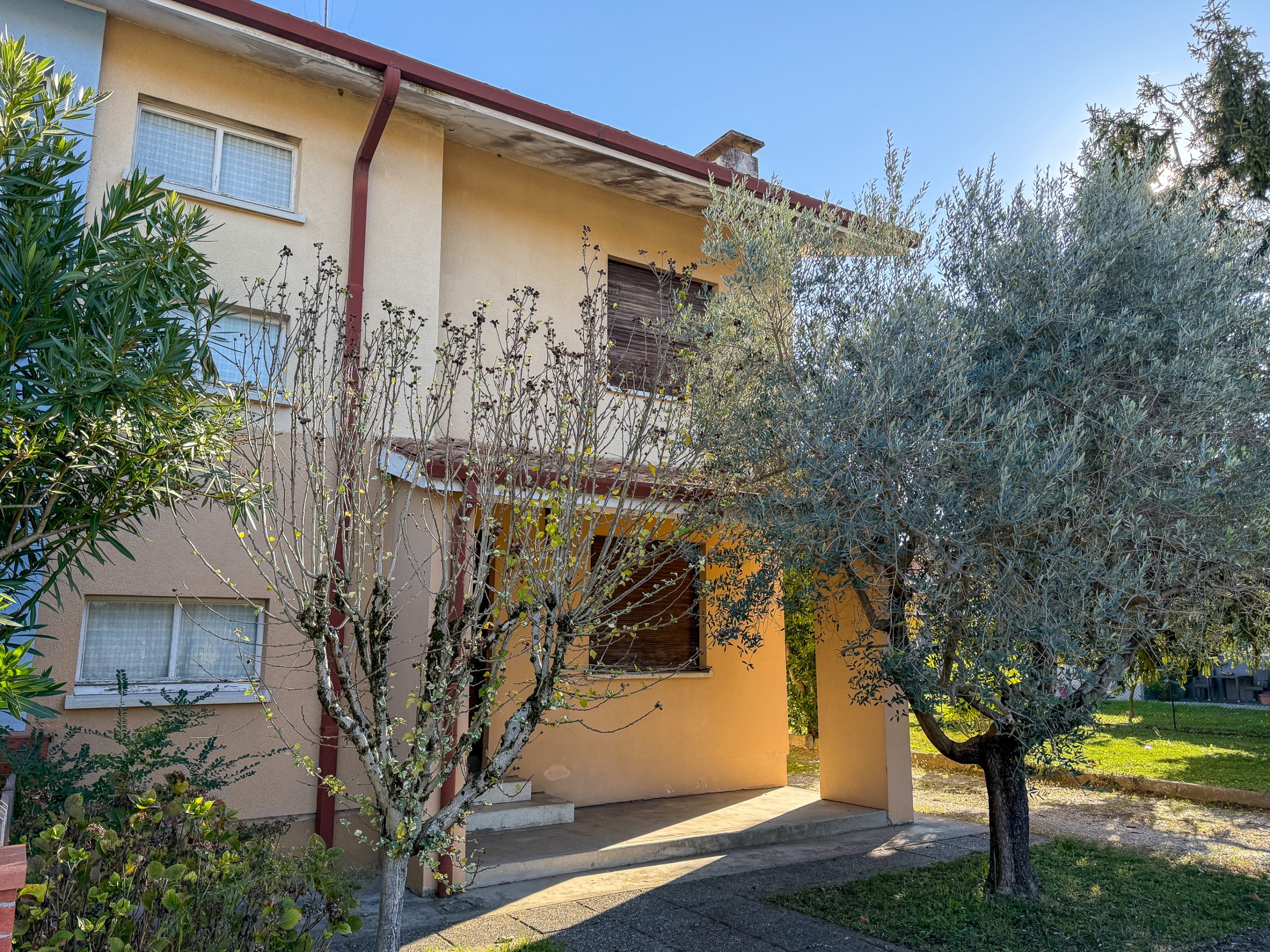 Casa accostata su due livelli e soffitta con ampio giardino e garage doppio. Al piano terra troviamo una cucina abitabile, un soggiorno/salotto, ripostiglio e bagno. L’accesso alla casa è duplice: fronte strada e sul retro. Al piano primo tre camere. Possibilità di ampliamento della struttura abitativa. Un esempio di ampliamento è visibile presso la casa affianco.